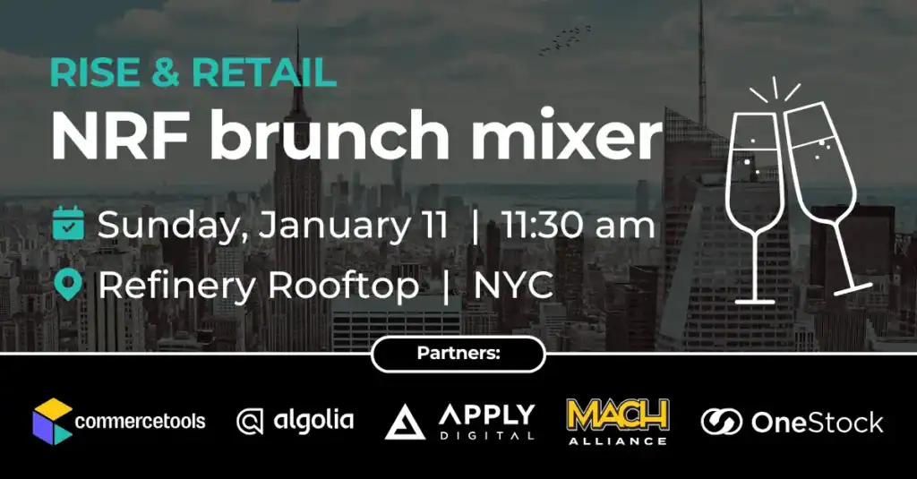 Acompáñanos en «Rise & Retail», un brunch informal en una azotea organizado junto con commercetools, Algolia, Apply Digital, y con el orgulloso patrocinio de la MACH Alliance. Es el reinicio perfecto para el primer día de la NRF: buena comida, buena gente y cero formalidades.